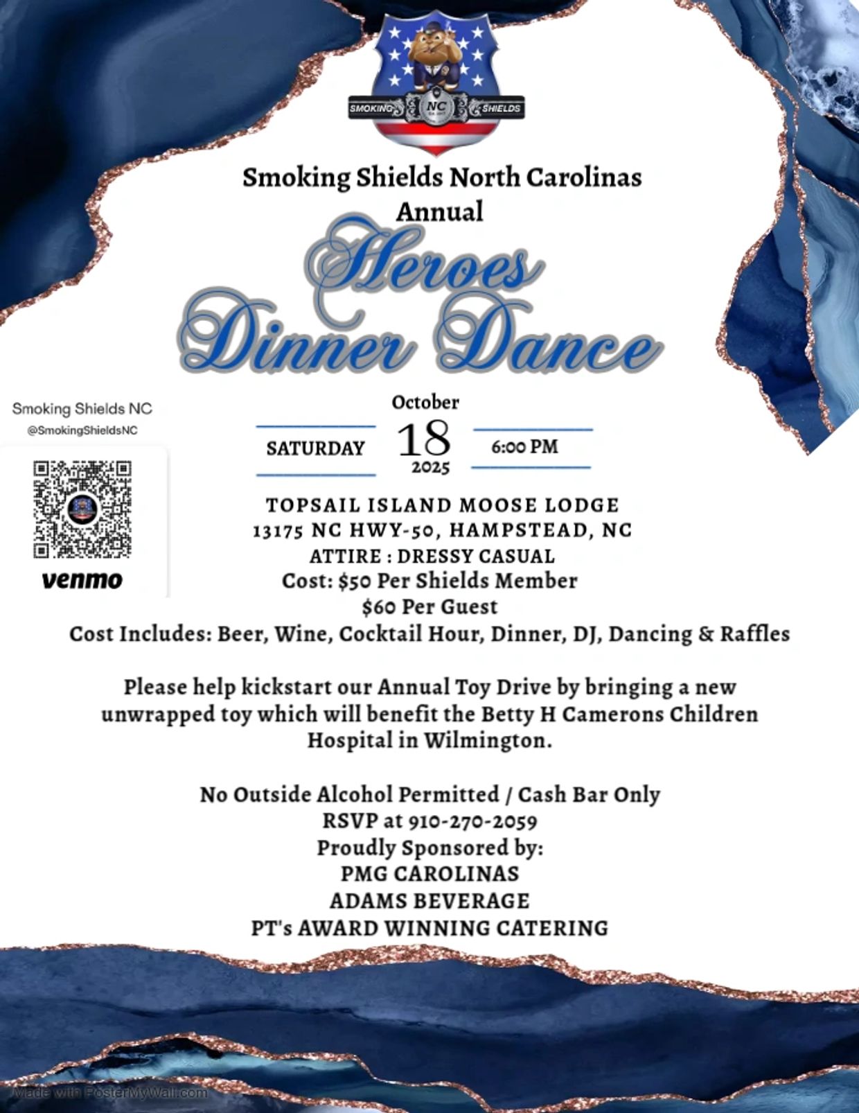 Cost includes: Beer, Wine , Cocktail Hour, Dinner, DJ, Dancing & Raffles.